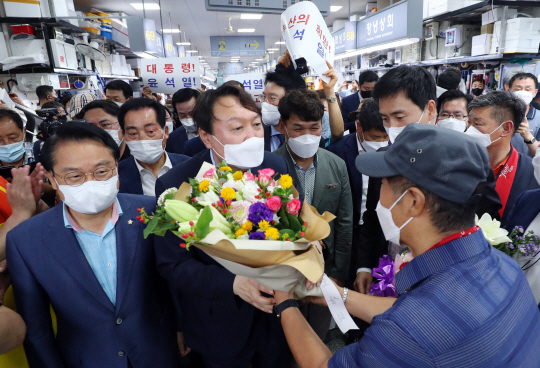 ▲ 자갈치 시장서 꽃다발 받은 尹 야권 유력 대선주자인 윤석열(앞줄 왼쪽 두 번째) 전 검찰총장이 27일 부산 중구 자갈치시장을 찾아 지지자로부터 꽃다발을 건네받고 있다.