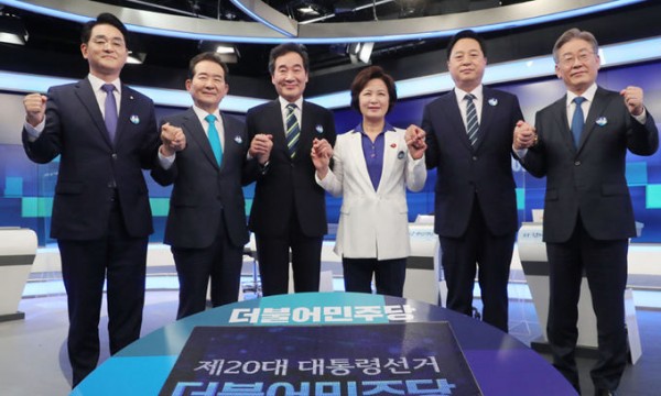 더불어민주당 대선경선 후보들이 28일 서울 중구 매경미디어센터 MBN스튜디오에서 MBN과 연합뉴스TV 공동주관으로 열린 본경선 1차 TV토론회에서 포토타임을 갖고 있다. 왼쪽부터 박용진, 정세균, 이낙연, 추미애, 김두관, 이재명 후보. 국회사진기자단.