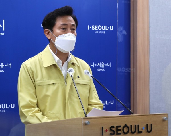 오세훈 서울시장이 지난 7일 오후 서울시청 브리핑룸에서 코로나19 확진자 급증과 관련한 긴급 대책회의 결과를 발표하고 있다.