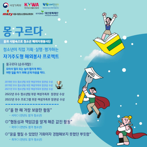 2023년 4월 24일 -- 서울시립청소년문화교류센터(미지센터)는 7월 23일(일)부터 29일(토)까지 6박 7일간 몽골 울란바토르 일원으로 청소년 해외 자원봉사단을 파견한다. 참가 대상은 전국의 만 15~24세 연령의 사회적 배려 청소년으로 해외여행 및 단체 활동에 결격 사항이 없어야 한다.