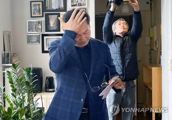 (파리=연합뉴스) 현혜란 특파원 = 더불어민주당 송영길 전 대표가 22일(현지시간) 파리 3구 한 사무실에서 한국 특파원들과 만나 2021년 전당대회 돈 봉투 의혹과 관련해 입장을 밝히기 전 인사하고 있다. 2023.4.22 runran@yna.co.kr
