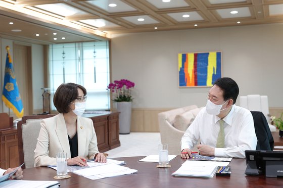 윤석열 대통령이 12일 용산 집무실에서 이영 중소벤처기업부 장관으로부터 업무보고를 받으며 대화하고 있다. [대통령실 제공]