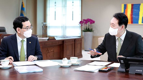 도어스테핑으로 일정을 시작한 윤 대통령은 전날 기획재정부에 이어 산업통상자원부와 중소벤처기업부 장관으로부터 독대 업무보고를 받았다. 각 부처에선 장관만 참석했고, 대통령실에선 윤 대통령과 김대기 비서실장, 최상목 경제수석이 배석했다.