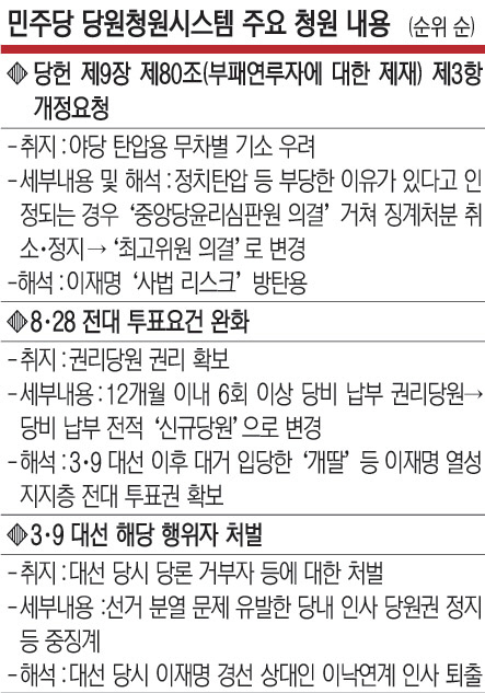 두 번째로 많은 4878명이 동의한 ‘전당대회 투표권 줘’라는 제목의 청원도 이 의원에게 유리한 내용이다. 글쓴이는 해당 청원에서 당비 납부 전적이 있는 신규당원도 전당대회 투표권을 보장해달라고 요구했다. 3·9 대선 이후 대거 입당한 개딸 등 이 의원 열성 지지층이 오는 8·28 전당대회에서 투표권을 갖지 못한 데 대한 항의 차원으로 풀이된다. 3위는 개딸 등에서 이른바 ‘수박’(겉은 민주당 속은 국민의힘)으로 속칭한 인사에 대한 당원권 박탈을 요구하는 ‘대선해당행위자처벌’(3903명 동의)이 차지했다.
