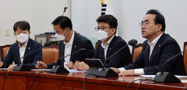 민주 원내대책회의 박홍근(오른쪽) 더불어민주당 원내대표가 2일 오전 국회에서 열린 원내대책회의에 참석해 모두발언을 하고 있다. 국회사진기자단.