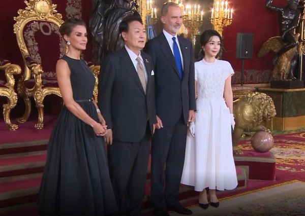 펠리페 6세 스페인 국왕 내외가 주최한 갈라 만찬에 참석한 윤석열 대통령과 김건희 여사가 국왕 내외의 안내를 받아 사진 촬영에 임하는 모습이 포착됐다.