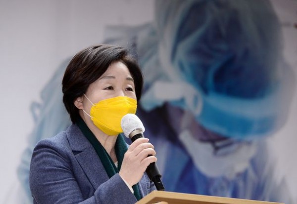 심상정 정의당 대선 후보가 19일 서울 영등포구 전국보건의료산업노동조합 생명홀에서 열린 '코로나 영웅들의 질문에 답한다' 보건의료정책 토론회에 참석해 인사말을 하고 있다.