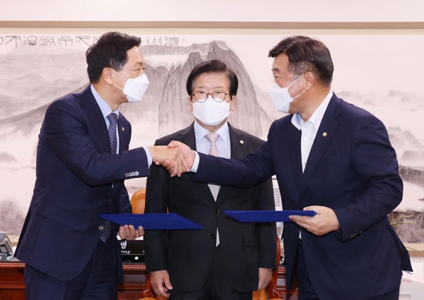 지난 8월31일 서울 여의도 국회 의장실에서 더불어민주당 윤호중 원내대표(오른쪽)와 국민의힘 김기현 원내대표(왼쪽)가 언론중재법 개정안을 위한 합의문을 교환하고 있다.