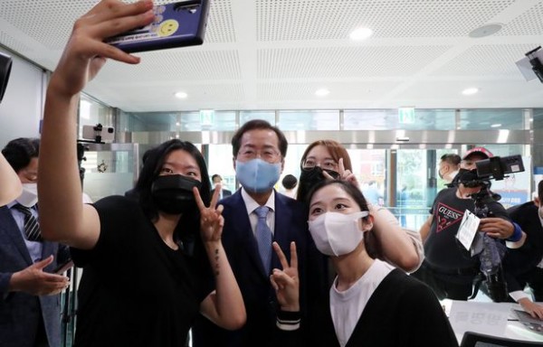 국민의힘 대선 주자인 홍준표 의원이 17일 서울 자곡동의 남명학사 서울관을 방문해 학생들과 기념촬영하고 있다.