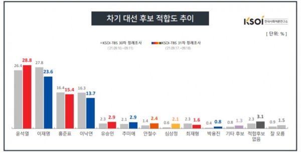 한국사회여론연구소(KSOI)가 TBS의뢰로 지난 17~18일 이틀간 전국 만 18세 이상 유권자 1004명을 대상으로 ‘차기 대선 후보로 누가 적합하다고 보는가'를 물은 결과, 윤 전 총장은 전주보다 2.4%포인트 상승한 28.8%, 이 지사는 전주대비 4.2%포인트 하락한 23.6%를 기록했다. 오차범위 내 접전이다.