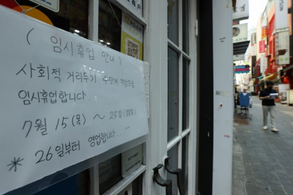 지난 21일 오후 서울 중구 명동의 한 가게에 사회적 거리두기 4단계 격상으로 인한 임시휴업 안내문이 붙어있다.