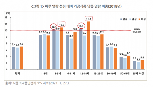 보고서에 따르면, 우리 국민의 가공식품 첨가 당류(가당) 섭취는 하루 열량 섭취의 7.4%에 달하며, 특히 30세 미만 연령층의 가당 섭취는 세계보건기구(WHO) 권고치에 상당하고 있다.