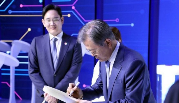 문재인 대통령(오른쪽)이 지난 2019년 4월 30일 오후 경기도 화성 삼성전자 화성캠퍼스 부품연구동(DSR)에서 개최된 '시스템 반도체 비전 선포식'에서 이재용 삼성전자 부회장이 지켜보는 가운데 세계 최초로 극자외선(EUV) 7나노 공정으로 출하된 웨이퍼와 칩에 서명을 하고 있다.