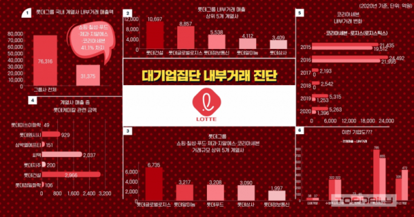 이와 함께 롯데 상사는 전체 매출 4797억원 중 3409억원(71%)가 내부거래며 롯데쇼핑이 24.4%, 롯데푸드가 37%를 차지했다. 또 씨에이치음료는 롯데칠성, 스위트위드는 롯데제과, 푸드위드는 롯데푸드 비중이 100%며 롯데알미늄은 롯데칠성 비중이 28%나 차지했다.