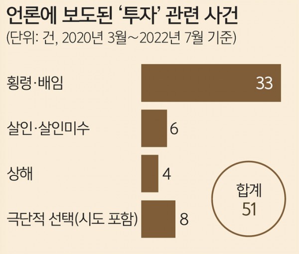 7일 hbs가 신종 코로나바이러스 감염증(코로나19)이 발생한 직후인 2020년 3월부터 2022년 7월까지 언론에 보도된 형사사건을 분석한 결과 ‘투자’가 범행동기인 사건이 총 43건으로 파악됐다. 한 달에 1.5번은 투자실패 때문에, 혹은 투자금 마련을 위해 범행이 이뤄진 것이다. 혐의는 살인과 살인미수, 상해, 폭행, 횡령, 배임으로만 한정했다. 극단적 선택(시도 포함) 8건을 포함하면 그 수는 51건으로 늘어난다.