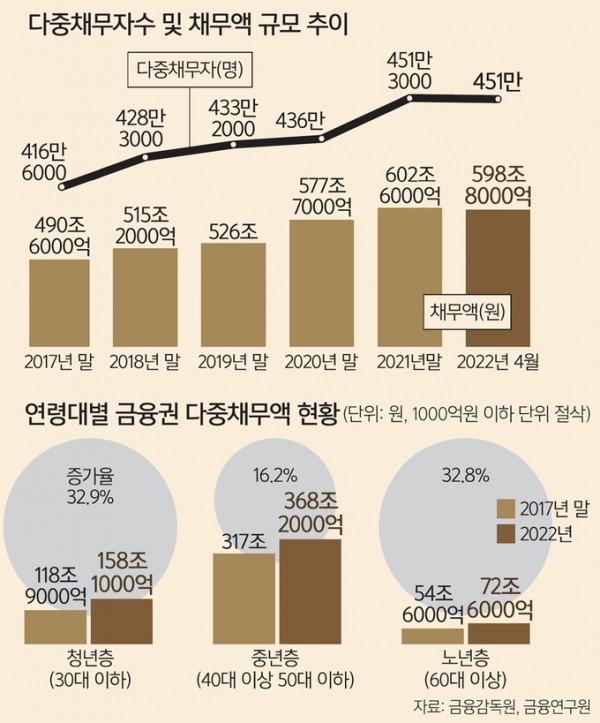 금융감독원에 따르면 지난 4월 말 기준 금융권 전체의 다중채무자는 451만명, 채무액 규모는 598조8000억원 수준으로, 2017년 말(416만6000명·490조6000억원)보다 각각 34만4000명(8.3%), 108조2000억원(22.0%) 증가했다.
