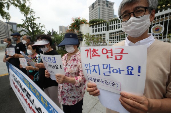 노년알바노조 준비위원회와 평등노동자회 등 노년단체 회원들이 지난 7월 서울 종로구 정부서울청사 앞에서 65세 이상 모든 노인에게 차별없는 `기초연금` 지급을 촉구하는 기자회견을 하고 있다.