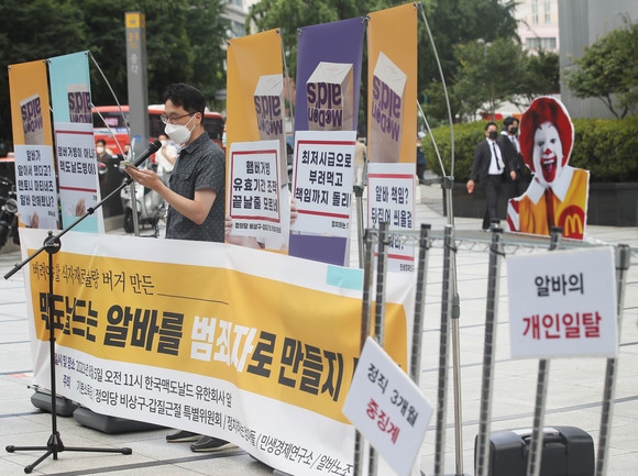 정의당·아르바이트노조 등이 5일 오전 서울 종로구 한국맥도날드 본사 앞에서 '맥도날드는 알바를 범죄자로 만들지 마라'기자회견을 하고 있다.