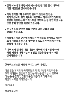 맥도날드는 "이번 일을 계기로 한국맥도날드의 1만5000명의 임직원은 고객 여러분이 안심하고 맛있는 메뉴를 즐기실 수 있도록 더 높은 품질의 안전한 제품을 제공해 드리기 위해 최선의 노력을 다 하겠다"며 글을 마쳤다.