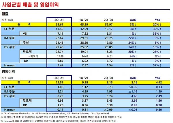 반도체가 여전히 큰 비중을 차지하지만 사업부문별로 고른 실적을 보여준 게 호실적의 이유다. 반도체는 서버와 함께 코로나19에 따른 Work From Home 트렌드가 지속되면서 PC와 노트북, 신학기 대비 교육용 크롬북 수요가 증가했고 예상 대비 높은 평균판매단가를 보이며 22조7400억원 매출액에 6조9300억원 영업이익을 기록했다.
