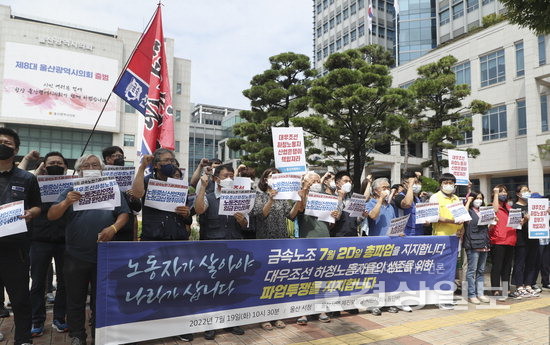 울산지역 20여개 진보정당 및 사회단체들은 이날 울산시청 앞에서 기자회견을 열고 “노동 중심 산업전환, 대우조선 하천노동자 투쟁 승리, 금속노조 7·20 총파업을 지지한다”고 밝혔다.