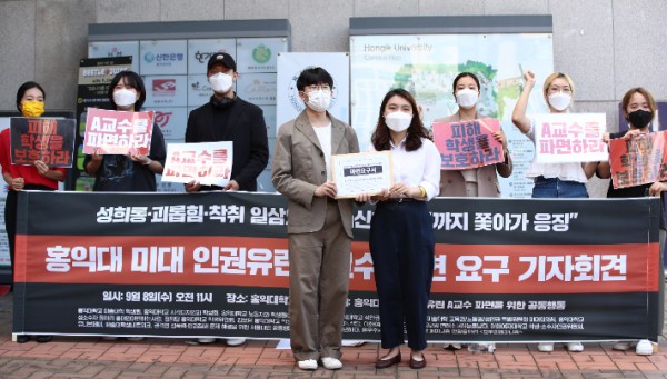 '홍익대 미대 인권유린 A교수 파면을 위한 공동행동'(공동행동)은 8일 오전 홍익대 정문 앞에서 기자회견을 열고 "A교수는 성관계 요구 등 강의실 안팎에서 성희롱 발언을 하고 학생 괴롭힘·교권 남용·노동력 착취 등 권력형 성폭력과 인권유린을 지속적으로 자행해 왔다"며 "A교수에 대한 조속한 파면 및 피해자 보호조치를 요구한다"고 주장했다.