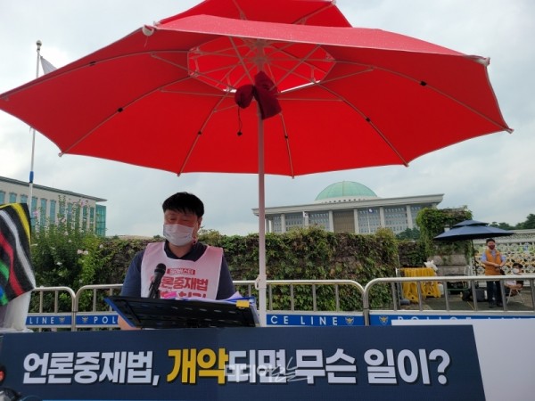 성 회장은 이들은 언급하며 “이명박‧박근혜 정부 때 같이 서주셨던 분들”이라고 설명했다. 성 회장을 안타까움을 표하면서도 “되묻고 싶다. 이 법이 통과되면 조중동이 없어지는가”라고 말했다.