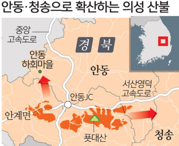 엎친 데 덮친 격으로 불길은 이날 오후 3시쯤 안동 풍천면까지 확산했다. 산불은 하회마을, 병산서원과 직선거리로 8㎞가량 떨어진 곳까지 번졌다.