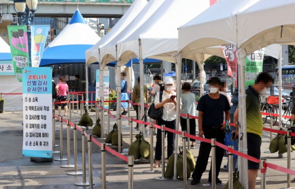 16일 서울역 광장에 마련된 신종 코로나바이러스 감염증(코로나19) 임시 선별검사소에서 시민들이 검사를 위해 줄을 서고 있다.