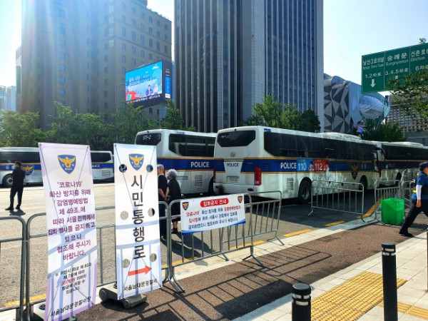 광복절 당일에도 서울 도심에 차벽·펜스 설치.