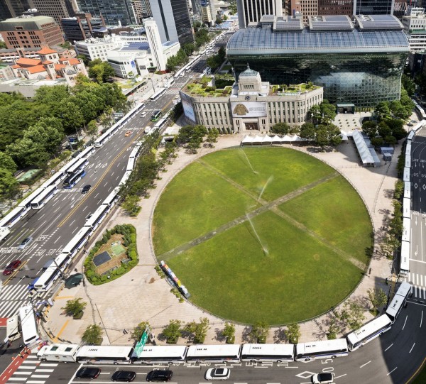 2021년 8월 15일 서울시 서울광장 주변 도로에 차벽과 펜스가 설치돼 있다. 경찰은 최대 186개 부대와 가용 장비를 최대한 활용해 집결 단계부터 불법집회를 차단했다.