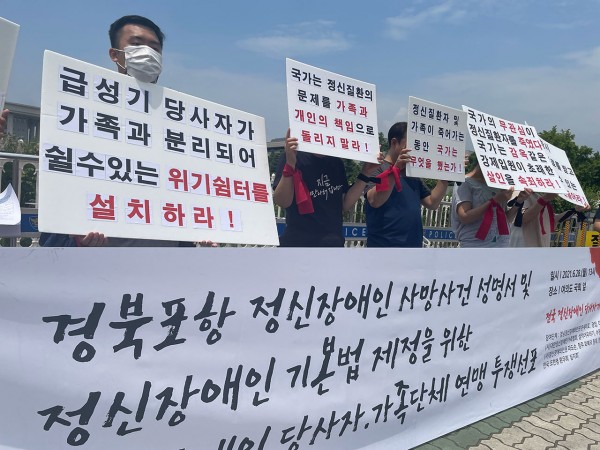 6월28일 국회 앞에서 전국 정신장애인 당사자·가족단체 연맹 회원이 정신장애인에 대한 국가와 사회의 책임을 묻는 기자회견을 하고 있다.