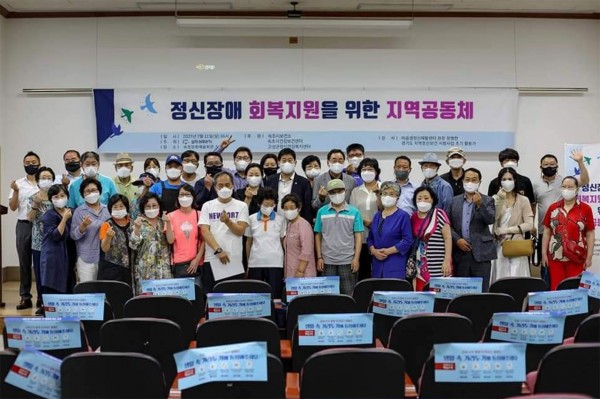 7월11일 조현병 당사자·가족 모임인 ‘설악 어우러기’ 강연회에서 참가자들이 기념 촬영을 하고 있다.