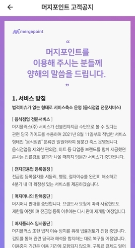 회사는 "머지플러스 서비스가 선불전자지급 수단으로 볼 수 있다는 관련 당국 가이드를 수용해 11일부로 당분간 적법한 서비스 형태인 '음식점업' 분류만 일원화해 축소 운영된다"며 "전자금융업 등록 절차를 서둘러 행정절차 이슈를 완전히 해소하고 4분기 내에 더 확장성 있는 서비스를 제공하겠다"고 안내했다.
