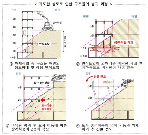 철거할 건물과 쌓아둔 흙 간 이격 거리를 두지 않았던 점, 상층부부터 순차적으로 철거를 하지 않았던 점이 일반적인 공법과 달랐다. 주먹구구식 공사의 결과는 도로를 덮쳤고 인명 피해를 유발했다. 사고조사위는 “무리한 해체 방식”이라는 진단을 내렸다.