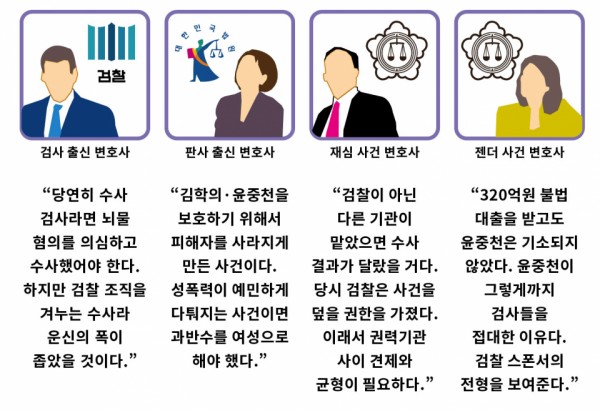 젠더 사건 변호사:윤중천한테 접대를 받은 사람이 김학의 한 명이겠나. 아니다. 검사 이름도 여럿 거론된다. 게다가 평소 윤중천이 성관계 동영상을 찍는 습벽이 있다고 했는데, 드러난 건 ‘김학의 동영상’ 하나다. 그래서 수사를 하지 않은 게 아닐까. 압수수색하면 뭐라도 나올까 봐 피한 것 같다. 검찰 조직이 흔들리는 사건이었다. 대한민국에서 검사가 연루된 범죄가 발각되면 어떻게 되는지를 보여주는 전형적인 사건이다. 연루된 당사자가 김학의가 아니라 대통령이었다면 검찰은 9족을 털었을 거다. 9족의 반려견에, 반려견을 치료하는 의사까지, 통신·계좌 뭐든 전부 다 추적했을 거다.