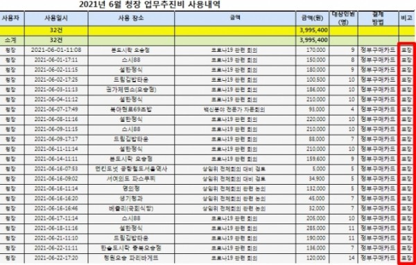 해당 자료에는 사용일시, 사용점포, 사용용도, 가격, 대상 인원 등이 상세히 기록돼 있었다. 대부분 음식점이었고, 비고란에는 전부 다 ‘포장’이라고 적혀 있었던 것도 눈에 띈다.