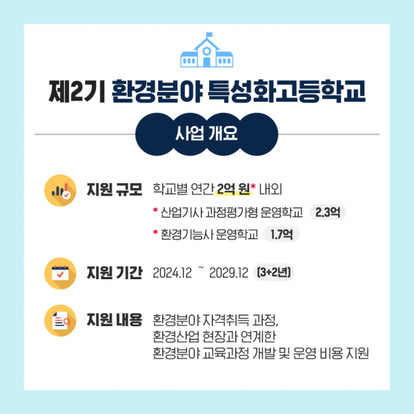 제2기 사업에 선정된 특성화고등학교는 2025년부터 2029년까지 5년간 매년 2억 원 규모의 예산을 지원받아 산업기사 등 환경분야