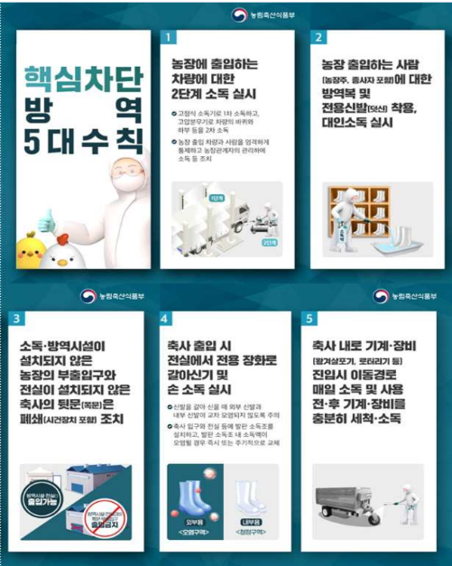 마음가짐으로 차단방역 수칙을 철저히 준수하는 것이 무엇보다 중요하다"고 강조하였다. 아울러 "사육 중인 가금에서 폐사 증가, 산란율 저하 등