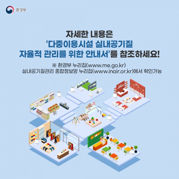 또한, 실제 현장에서 차질 없이 강화된 기준을 준수할 수 있도록 ‘다중이용시설 실내공기질 자율적 관리 안내서*’를 활용하여 각 지자체와 다중이용시설