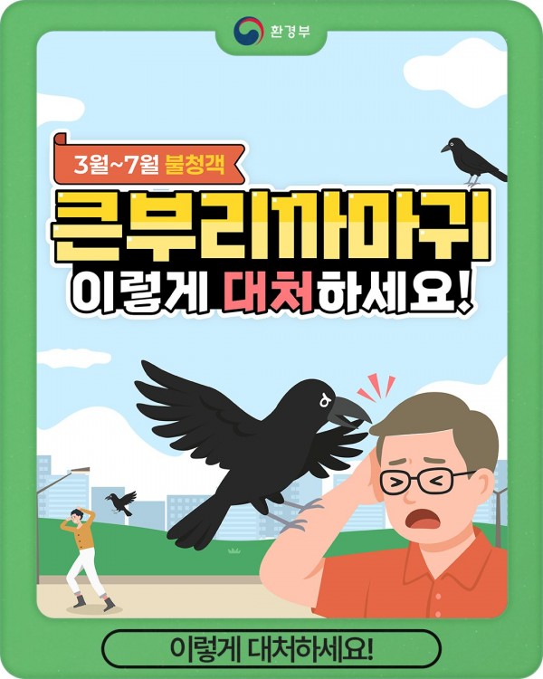 환경부(장관 김완섭)는 최근 번식기를 맞아 예민해진 큰부리까마귀의 공격 사례가 늘어남에 따라 안전과 공존을 위한 국민행동 요령을 안내하고,