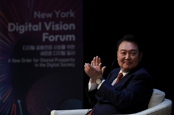 윤석열 대통령이 21일(현지시간) 뉴욕대학교에서 열린 뉴욕 디지털 비전 포럼에서 참석자들과 함께 박수치고 있다. (공동취재) 2023.09.21. [사진=뉴시스]