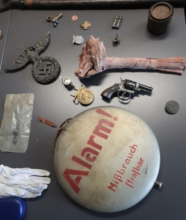 이 숨겨진 공간에서 히틀러의 초상화, 방독면, 고장난 권총, 나치 휘장 등 나치의 유물이 쏟아져 나왔다.