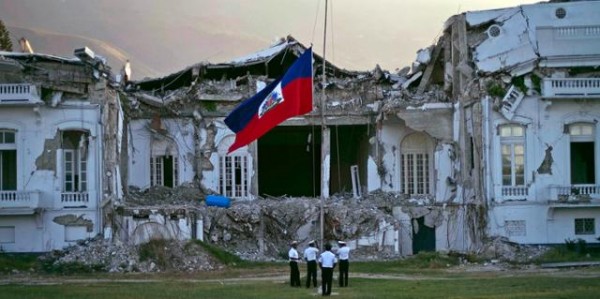 2010년 아이티 대지진이 발생한 지 꼭 1년 뒤인 2011년 1월, 무너져 내린 채 남아있는 수도 포르토프랭스의 대통령 궁 앞에 조기가 게양돼 있다. 포르토프랭스.