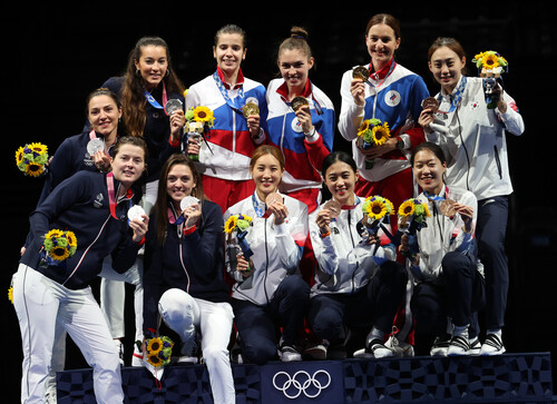 31일 열린 2020 도쿄올림픽 펜싱 여자 사브르 단체전에서 금·은·동을 차지한 러시아, 프랑스, 한국 선수들이 기념촬영을 하고 있다.