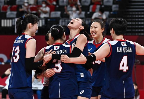 한국 여자배구 대표팀 선수들이 4일 일본 도쿄 아리아케 아레나 경기장에서 열린 2020 도쿄올림픽 여자배구 8강전 터키와의 경기에서 공격을 성공시킨 후 함께 기뻐하고 있다. 도쿄