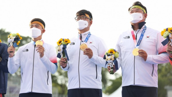 한국 남자 양궁 대표팀의 오진혁(40·현대제철)과 김우진(29·청주시청), 김제덕(17·경북일고)은 26일 일본 도쿄의 유메노시마공원 양궁장에서 열린 남자 단체전에서 금메달을 목에 걸었다. 한국은 이번 대회에서 처음 만들어진 혼성단체전과 여자단체전, 남자단체전 등 지금까지 치러진 3개 종목에서 모두 금메달을 거머쥐었다. 여자 남자 개인전은 오는 30일과 31일 이틀간 치러진다. ‘전종목 금메달’ 가능성은 어느때보다 높다. 한국은 지난 2016년 리우올림픽에서도 전종목 금메달 행진을 벌인 바 있다.