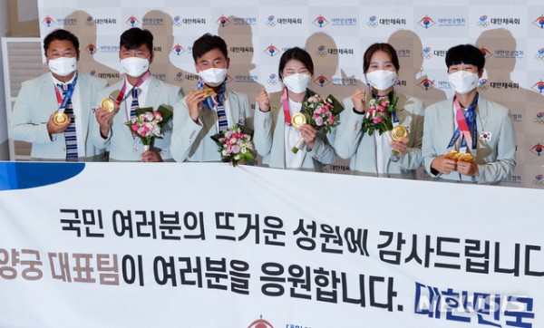 대한민국 양궁 대표팀이 1일 오후 2020 도쿄올림픽을 일정을 마치고 인천국제공항을 통해 귀국하고 있다. 왼쪽부터 오진혁, 김우진, 김제덕, 강채영, 장민희, 안산. (공동취재사진) 2021.08.01.