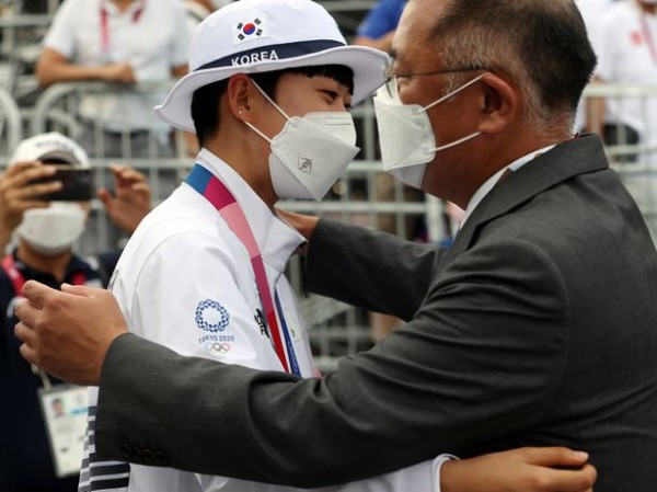 7월 30일 일본 유메노시마 공원 양궁장에서 열린 도쿄올림픽 양궁 여자 개인전 결승에서 금메달을 차지한 안산이 정의선 현대차그룹 회장과 포옹하고 있다.