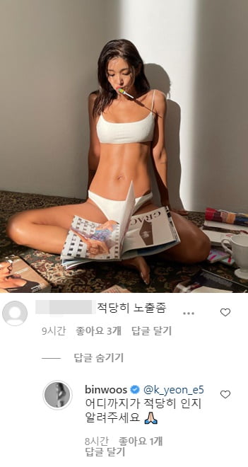 이에 한 누리꾼은 12일 해당 게시물에 "적당히 노출 좀"이라는 댓글을 달았다. 이를 본 김빈우는 "어디까지가 적당히인지 알려달라"고 맞받아쳤다. 정중한 표현을 썼지만 그의 불편한 심기가 고스란히 나타났다.